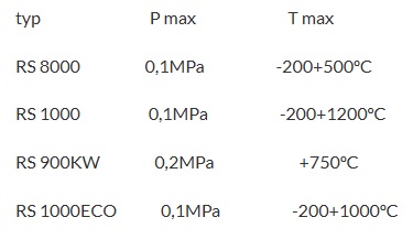 RS 8000 – Szczeliwo z włókien szklanych. Typ  RS 8020T – w impregnacji PTFE. ( kolor niebieski) ; typ  RS 8040G – wykonany w dyspersji grafitowej ;  typ  RS 8110 – ze wzmocnieniem chromoniklowym.