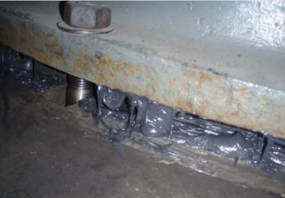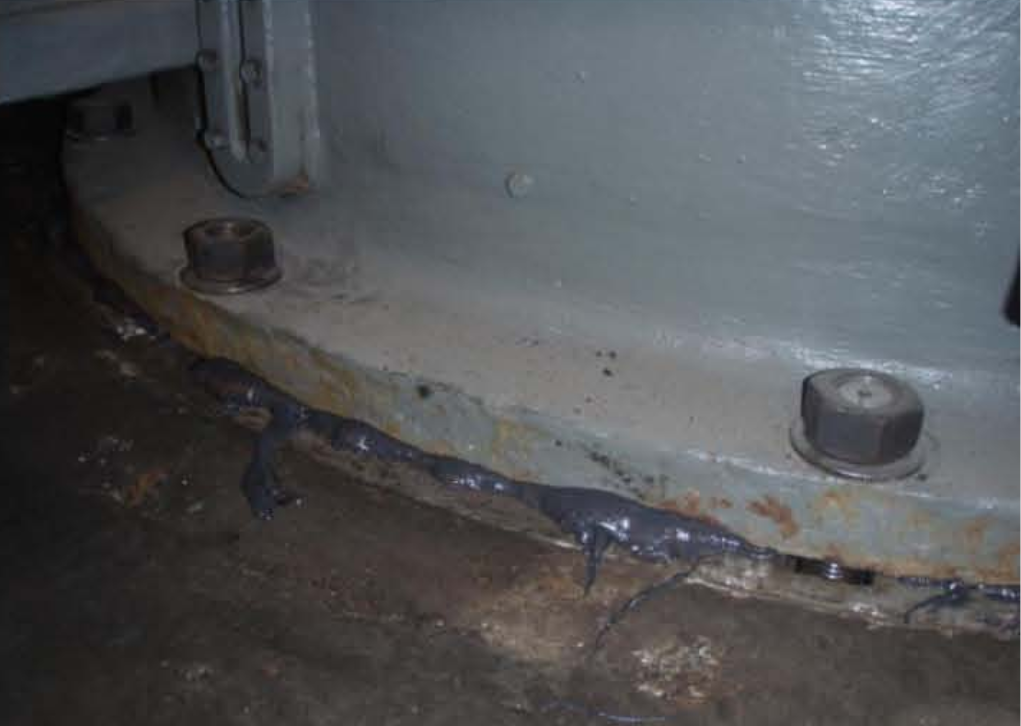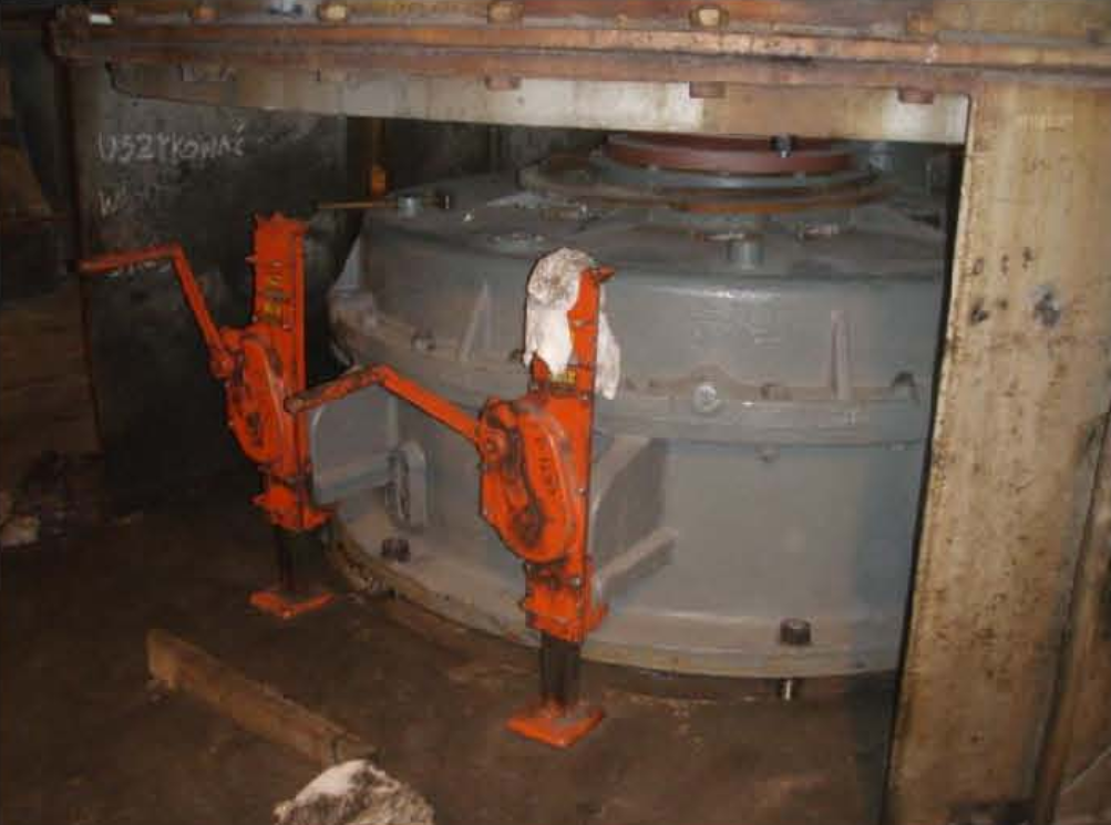 Opis naprawy: Posadowienie przekładni młyna kulowego było nieprawidłowe. Generowało to między innymi duże amplitudy drgań podczas obciążenia, pracy. Odbudowano powierzchnie ramy fundamentowej wprowadzając w przestrzeń między ramą a przekładnią materiał kompozytowy RM 101, zapewniając płaszczyznowe przyleganie przekładni i zminimalizowano drgania.