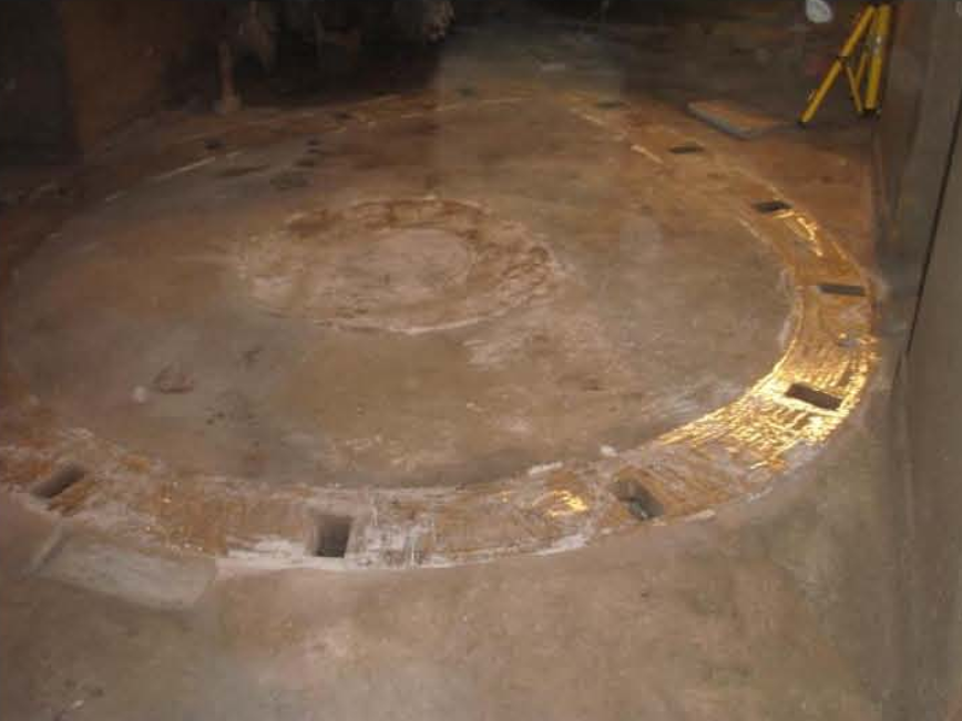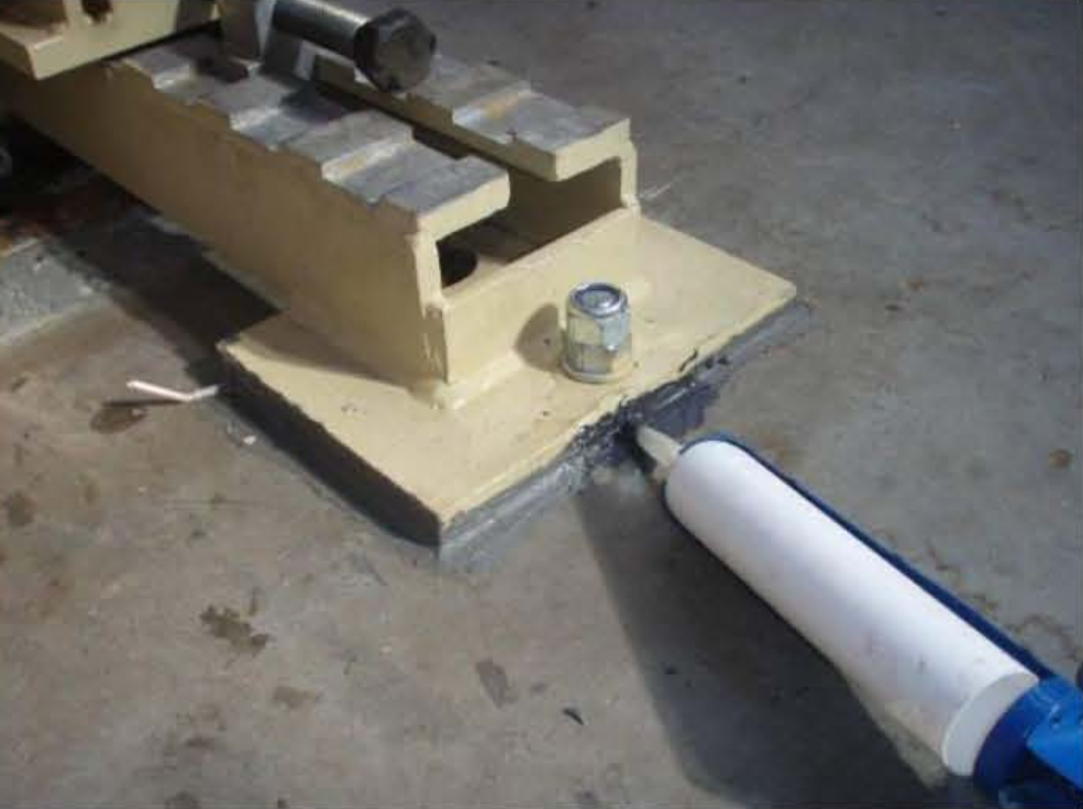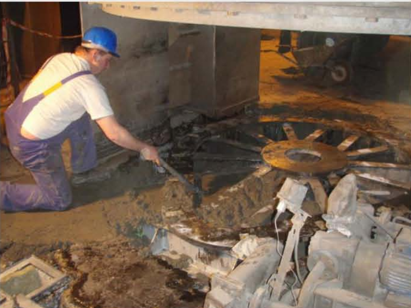 Opis naprawy: Rama fundamentowa pod przekładnią młyna kulowego odspoiła się od podłoża. Pomiary amplitudy drgań urządzenia wskazywały na znaczne przekroczenia (stany awaryjne). Żywicą z kruszywem kwarcowym wykonano międzywarstwę łączącą się ze starym podłożem betonowym i stalową ramą oraz nową nadlewką betonową.