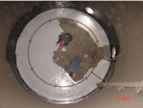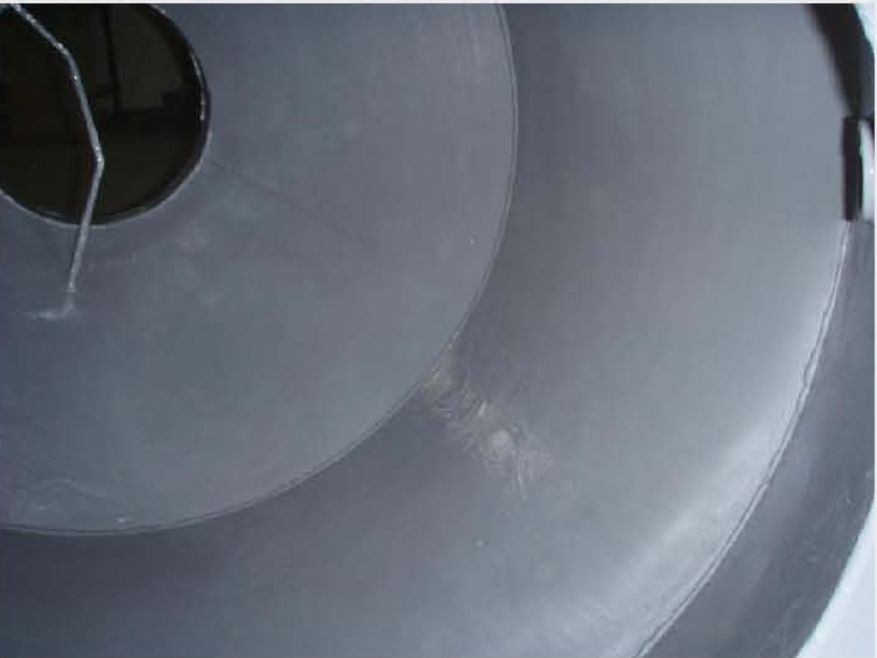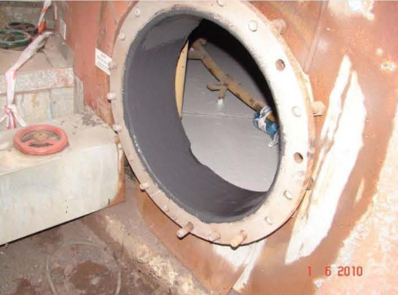 Opis naprawy: Stara powłoka nie była szczelna i nie zapewniała prawidłowego funkcjonowania zbiornika. Z wykorzystaniem obróbki strumieniowo-ściernej przygotowano podłoże i nałożono nową powłokę. Powłoka zapewnia odporność chemiczną i termiczną, jest szczelna.