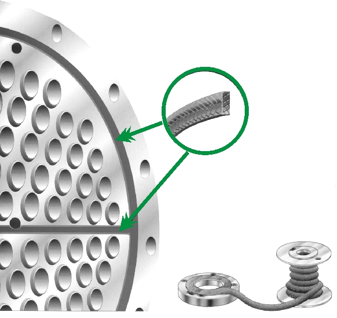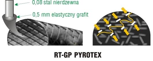 Przeformowanie taśmy RT-GP PYRO-TEX powoduje, że materiał zagęszcza się, tworząc szczelną uszczelkę metalowo-grafitową. Elastyczna i sprężysta struktura materiału, gdzie każdy metalowy pasek „sprężyny płytkowej” otoczony jest warstwą elastycznego grafitu, zapewnia wysoki powrót elastyczny i sprężystość. Dzięki temu, uformowana uszczelka zachowuje szczelność w bardzo szerokim zakresie naprężeń i może pracować na