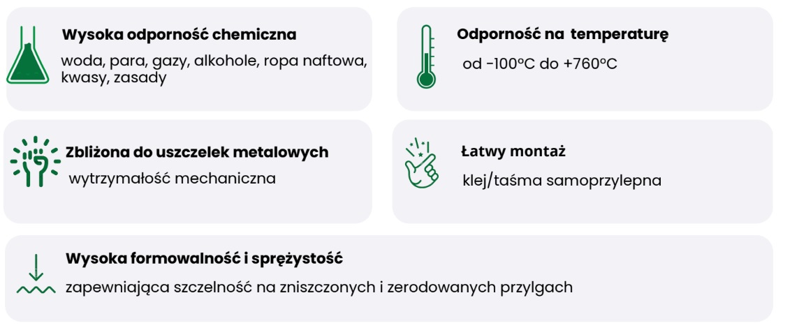 - Uszczelka nie ulega starzeniu, nie traci masy, zachowuje zdolność do utrzymania naprężeń.