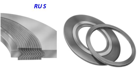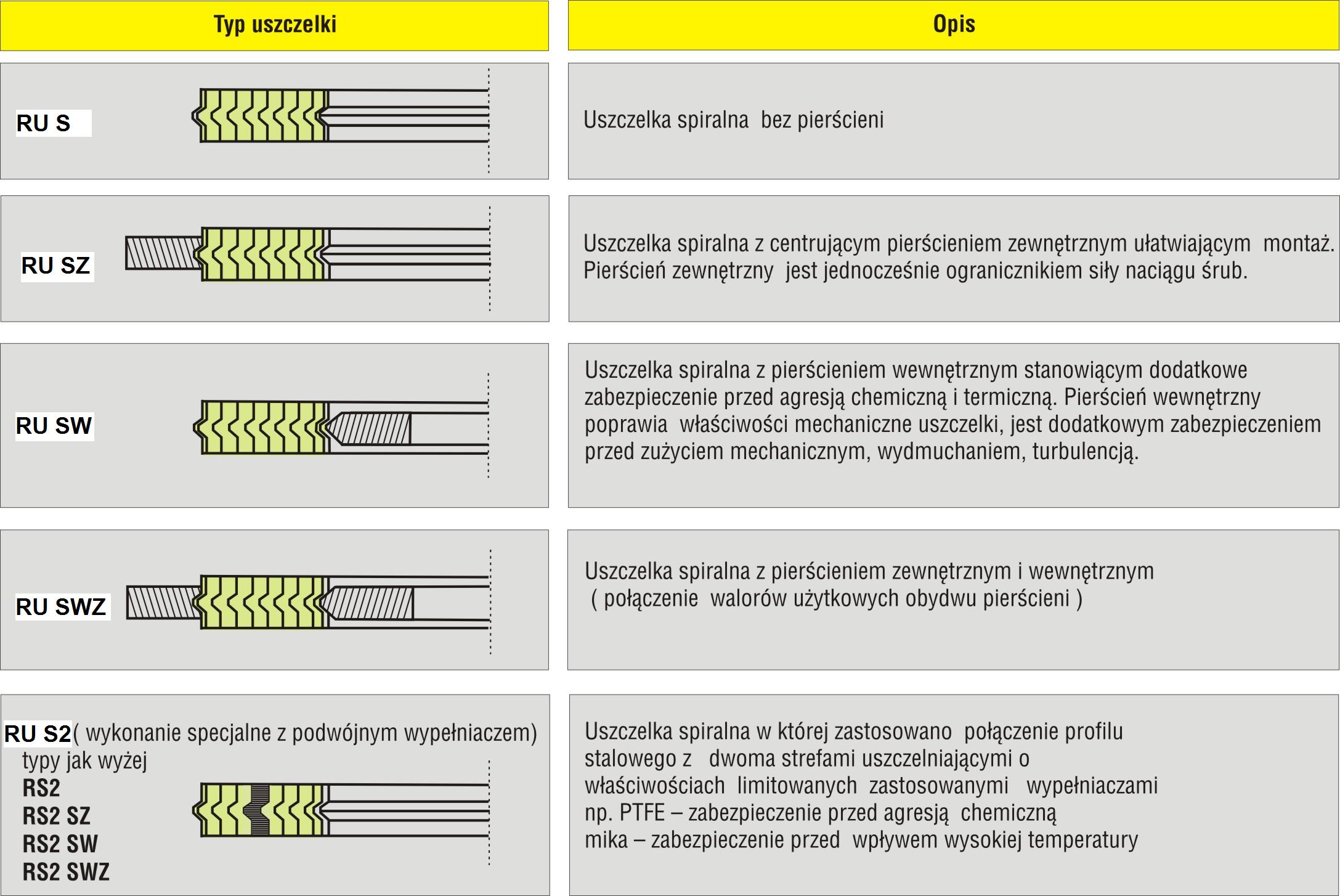Uszczelki spiralne RU S są połączeniem sprężystego profilu metalowej taśmy zwiniętej spiralnie z miękkim materiałem uszczelniającym. Są to uszczelki uniwersalne, których parametry uszczelniające można modyfikować przez zastosowanie odpowiednich wypełniaczy. Używając kombinacji dwóch rodzajów materiałów wypełniających otrzymujemy uszczelkę, która posiada strefy (1) o różnej charakterystyce. Główne zastosowanie, to węzły uszczelniające pracujące w zmiennych cyklach obciążeniowych. Uszczelnienia spiralne R S łączą odpornością na wysokie naciski powierzchniowe z dużym powrotem sprężystym. Zbliżone właściwości uszczelniające posiada także uszczelka RT GP PYRO-TEX.